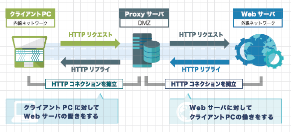 Proxyサーバを一言でいうと、『クライアントPCの代理としてインターネット接続を行うサーバ」である。ここでのProxyサーバは、HTTPトラフィックを対象としたWeb(HTTP)プロキシを指す。